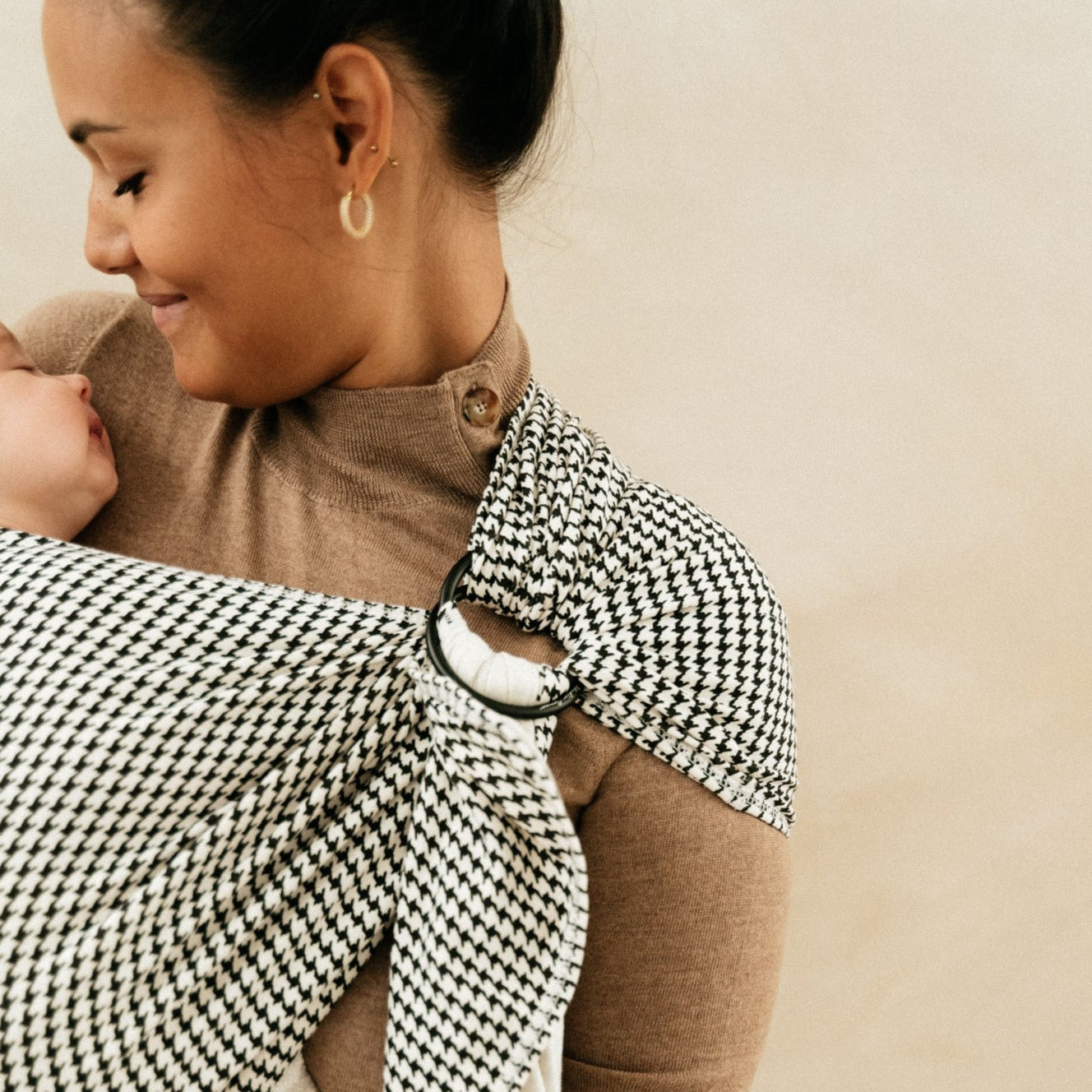 Once your baby is installed in the sling, pull the fabric up to the nape of the neck for optimal support and tighten the fabric using the rings.