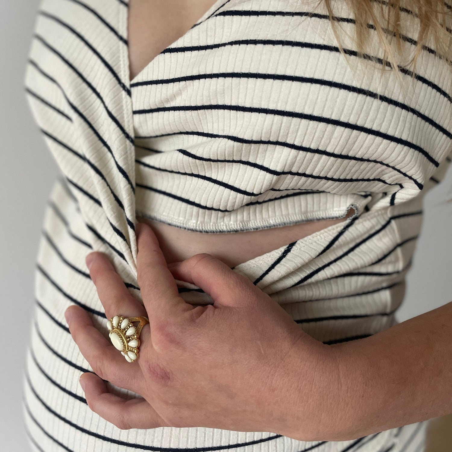 Studio Romeo launches a maternity capsule for pregnant and postpartum women! This t-shirt can be worn throughout pregnancy and even after thanks to its wrap-over opening that allows you to breastfeed easily. A new must-have which combines comfort and femininity.