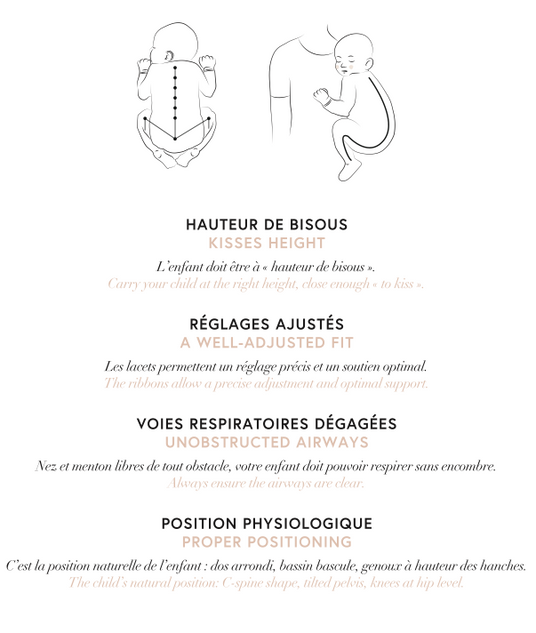 - The baby is well supported (at first you may even feel a little tight), shoulders covered by the bands, at kissing height (if necessary do a turn).